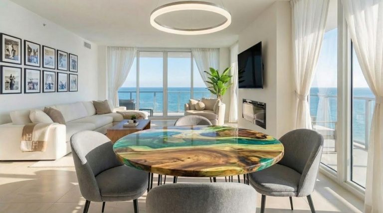 A stunning example of an Green round epoxy resin table that can be used for any purpose: Coffee Table – Dining Table – Office Table – Occasional Table.